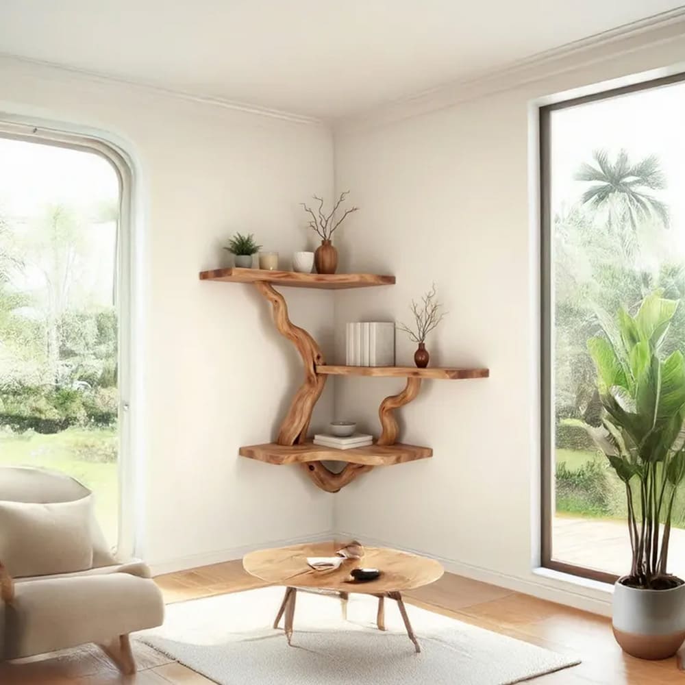 Driftwood corner shelf tree branch bookshelf wall mounted bookcase rustic furniture decor home art