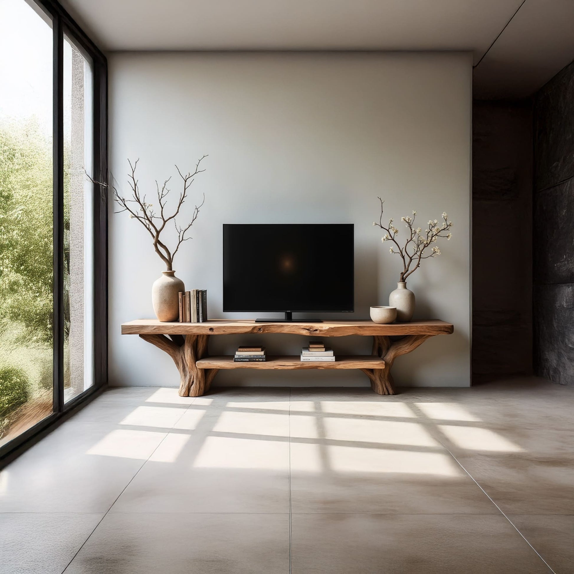 Built from time-worn wood and shaped by hand, this wall-mounted TV console table brings the soul of the forest into your living room. Each piece is carved from solid driftwood or reclaimed timber, chosen for its raw grain, live edge, and naturally aged character. Designed to float cleanly on the wall, it’s perfect for grounding your space with organic beauty while saving floor space.